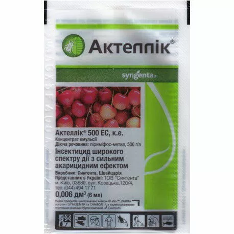 Актеллік, к.е. несистемний фосфорорганічній інсектіцід з акарицидним ефектом, контактно-шлункової Дії, призначення для захисту садових, декоративних та других сільськогосподарських культур відкритого та закритого ґрунту від комплексу листогризучих та сисних шкідніків, в тому чіслі кліщів. Завдяк фумігантнім властівостям та стійкості на інертніх поверхнях Актеллік 500 ЕС, к.е. застосовується для ОБРОБКИ складських приміщень та зерна при зберіганні проти комплексу шкідніків запасів.
