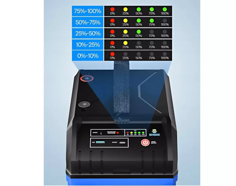 Оснащений інтелектуальною BMS-системою захисту від перезаряду, глибокого розряду, короткого замикання, перегріву та заряджання при низьких температурах. Має вбудований LED-індикатор рівня заряду, а також виходи USB та Type-C для прямого живлення електронних пристроїв. Корпус виготовлений з ударостійкого ABS-пластику. Не потребує обслуговування. Підходить для сонячних та вітрових електростанцій, ДБЖ, телекомунікаційного обладнання та резервного живлення.