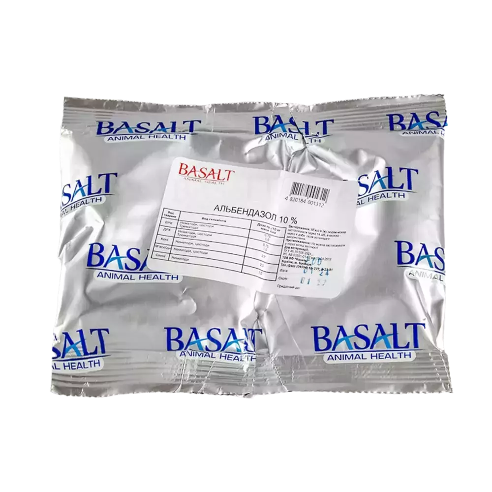 Опис: порошок білого або блідо-кремового кольору, погано розчинний у воді, з характерним запахом. Склад: 100г препарату містить діючу речовину: альбендазол – 10 г. Фармакологічні властивості: препарат альбендазол – 10% має універсальну антигельмінтну дію проти нематод, трематод та цестод шлунково-кишкового тракту та дихальних шляхів. Застосування: препарат використовують для лікування та профілактики гельмінтозів свійських і диких тварин. Препарат використовують для дегельмінтизації проти диктіокаульозу, фасціольозу, нематодозних та інших інвазій сільськогосподарських тварин і птиці. Дозування: альбендазол10% задають перорально, одноразово індивідуально або груповим методом з кормом в таких дозах: Вид тварини Клас гельмінтів Дози "Альбендазолу 10%" , г/1Окг ВРХ Нематоди 0,75 Цестоди 0,75 Трематоди 1,5 Вівці Нематоди 0,75 Цестоди 0,75 Трематоди 1,0 Свині Нематоди 1,0 М'ясоїдні Нематоди 2,5 Цестоди 2,5 Трематоди 2,5 Протипоказання: не застосовувати вагітним тваринам.