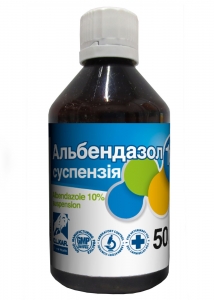 Опис Суспензія білого кольору без запаху та смаку. Склад 1 мл препарату містить діючу речовину: альбендазол 100 мг. Фармакологічні властивості АТСvet QP52А, протитрематодні ветеринарні препарати (АТСvet QP52AС11, альбендазол) Діюча речовина препарату - альбендазол - метил [5-(пропілсульфаніл)-1n-бензімідазол-2-іл] карбамат, належить до групи бензимідазолів. Альбендазол гальмує білковий (тубулярний) синтез, в результаті чого порушується надходження і внутрішньоклітинне транспортування поживних речовин та обмін аденозинтрифосфорної кислоти і глюкози. Знижуються мітохондріальні реакції через гальмування фумаратредуктази, що викликає зменшення кількості глікогену та загибель паразитів від виснаження. Альбендазол - антигельмінтик широкого спектру дії, ефективний щодо статевозрілих форм трематод (Fasciola hepatica і Dicrocоelium lanceatum), нематод, які паразитують у травному каналі і легенях (Bunostomum spp., Cooperia spp., Dictyocaulidae spp., Haemonchus spp., Nematodirus spp., Ostertagia spp., Strongyloides spp., Triсhostrongylus spp., Trichuris spp. тощо), та деяких видів цестод (Avitellina centripumctata, Moniezia expansa, Moniezia benedeni, Thysaniezia giardi). Застосування Дегельмінтизація великої рогатої худоби, овець, кіз, коней, свиней, собак, котів, хутрових звірів, птиці при ураженні нематодами (зрілими і незрілими формами), деякими видами цестод і трематод. Велика рогата худоба: нематоди, трематоди, цестоди. Вівці, кози: нематоди, трематоди, цестоди. Свині: нематоди. Коні та інші однокопиті: нематоди, цестоди. Собаки, коти, хутрові звірі: нематоди, цестоди. Кури: нематоди, трематоди. Дозування Препарат задають тваринам до початку ранкової годівлі з водою, індивідуально в дозах, наведених у таблиці: Дозування Альбендазолу суспензії для тварин різних видів Вид тварини Вид гельмінтів Доза альбендазолу, мл/10 кг маси тіла Велика рогата худоба Нематоди, цестоди трематоди 0,75(одноразово) 0,75(одноразово) 1,0(дворазово) Вівці, кози Нематоди, цестоди трематоди 0,5(одноразово) 0,5(одноразово) 1,0(дворазово) Свині Нематоди 1,0(одноразово) Коні та інші однокопитні Нематоди, цестоди 0,5(одноразово) Собаки, коти, хутрові звірі Нематоди, цестоди 2,0(одноразаво Кури Нематоди, трематоди 0,5(5 діб поспіль з кормом) Протипоказання Не застосовувати самкам протягом перших 4-6 тижнів після їх осіменіння. Застереження Забій великої рогатої худоби, овець та кіз на м'ясо дозволяється через 7 діб, свиней - через 10 діб, птиці - через 2 доби після останнього застосування препарату; використання у їжу внутрішніх органів (печінка, легені, серце) свиней дозволяється через 35 діб, жуйних тварин і птиці - через 20 діб, вживання молока - через 2 доби після останнього застосування препарату. Форма випуску Препарат фасують у скляні або поліпропіленові флакони по10, 50 мл, 1л. Зберігання Сухе, темне, недоступне для дітей місце при температурі від 0оС до 30оС. Не зберігати разом з харчовими продуктами, напоями, кормами для тварин. Термін придатності - 3 роки з дати виготовлення. Аналоги: Альбендазол 10% (Інвеса). Переваги:широкий спектр дії;низька токсичність;можливість застосування у розчині(випойка);завжди чітка виміряна доза..Застосовують не тільки ВРХ.