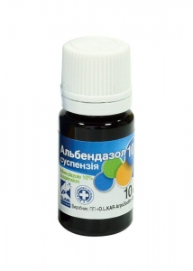 Опис Суспензія білого кольору без запаху та смаку. Склад 1 мл препарату містить діючу речовину: альбендазол 100 мг. Фармакологічні властивості АТСvet QP52А, протитрематодні ветеринарні препарати (АТСvet QP52AС11, альбендазол) Діюча речовина препарату - альбендазол - метил [5-(пропілсульфаніл)-1n-бензімідазол-2-іл] карбамат, належить до групи бензимідазолів. Альбендазол гальмує білковий (тубулярний) синтез, в результаті чого порушується надходження і внутрішньоклітинне транспортування поживних речовин та обмін аденозинтрифосфорної кислоти і глюкози. Знижуються мітохондріальні реакції через гальмування фумаратредуктази, що викликає зменшення кількості глікогену та загибель паразитів від виснаження. Альбендазол - антигельмінтик широкого спектру дії, ефективний щодо статевозрілих форм трематод (Fasciola hepatica і Dicrocоelium lanceatum), нематод, які паразитують у травному каналі і легенях (Bunostomum spp., Cooperia spp., Dictyocaulidae spp., Haemonchus spp., Nematodirus spp., Ostertagia spp., Strongyloides spp., Triсhostrongylus spp., Trichuris spp. тощо), та деяких видів цестод (Avitellina centripumctata, Moniezia expansa, Moniezia benedeni, Thysaniezia giardi). Застосування Дегельмінтизація великої рогатої худоби, овець, кіз, коней, свиней, собак, котів, хутрових звірів, птиці при ураженні нематодами (зрілими і незрілими формами), деякими видами цестод і трематод. Велика рогата худоба: нематоди, трематоди, цестоди. Вівці, кози: нематоди, трематоди, цестоди. Свині: нематоди. Коні та інші однокопиті: нематоди, цестоди. Собаки, коти, хутрові звірі: нематоди, цестоди. Кури: нематоди, трематоди. Дозування Препарат задають тваринам до початку ранкової годівлі з водою, індивідуально в дозах, наведених у таблиці: Дозування Альбендазолу суспензії для тварин різних видів Вид тварини Вид гельмінтів Доза альбендазолу, мл/10 кг маси тіла Велика рогата худоба Нематоди, цестоди трематоди 0,75(одноразово) 0,75(одноразово) 1,0(дворазово) Вівці, кози Нематоди, цестоди трематоди 0,5(одноразово) 0,5(одноразово) 1,0(дворазово) Свині Нематоди 1,0(одноразово) Коні та інші однокопитні Нематоди, цестоди 0,5(одноразово) Собаки, коти, хутрові звірі Нематоди, цестоди 2,0(одноразаво Кури Нематоди, трематоди 0,5(5 діб поспіль з кормом) Протипоказання Не застосовувати самкам протягом перших 4-6 тижнів після їх осіменіння. Застереження Забій великої рогатої худоби, овець та кіз на м'ясо дозволяється через 7 діб, свиней - через 10 діб, птиці - через 2 доби після останнього застосування препарату; використання у їжу внутрішніх органів (печінка, легені, серце) свиней дозволяється через 35 діб, жуйних тварин і птиці - через 20 діб, вживання молока - через 2 доби після останнього застосування препарату. Форма випуску Препарат фасують у скляні або поліпропіленові флакони по10, 50 мл, 1л. Зберігання Сухе, темне, недоступне для дітей місце при температурі від 0оС до 30оС. Не зберігати разом з харчовими продуктами, напоями, кормами для тварин. Термін придатності - 3 роки з дати виготовлення. Аналоги: Альбендазол 10% (Інвеса). Переваги:широкий спектр дії;низька токсичність;можливість застосування у розчині(випойка);завжди чітка виміряна доза..Застосовують не тільки ВРХ.