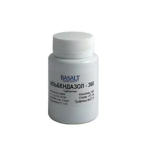 У пластикових банках або блістерах по 10, 25, 100 шт. Для дрібних тварин альбендазол – 360 випускається зі смаком яловичини.