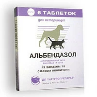 Альбендазол 6 таблеток з запахом і смаком яловичини Натуропрепарат призначений для профілактики і лікування шлунково-кишкових та легеневих нематодозах, деяких цестодозах і трематодозах собак і котів. Має високу ефективність проти всіх видів цестод і нематод. Альбендазол має овоцидным дію (знищує яйця гельмінтів). Препарат застосовують собакам і кішкам для лікування хвороб, викликаних наступними видами гельмінтів: токсокари (Toxocara spp), Токсаскары (Toxascaris spp), Унцинарии (Uncinaria Stenocephala), анкілостома (Ancylostoma caninum), трихоцефалы (Trichocephalus spp), Дипилидии (Dipylidium caninum), дифилоботрии (Diphyllobotrium latum) та ін.