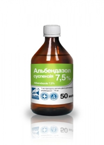 1 мл препарату містить діючу речовину: альбендазол 75 мг. Застосування Дегельмінтизація великої рогатої худоби, овець, кіз, коней, свиней, собак, котів, хутрових звірів, птиці при ураженні нематодами (зрілими і незрілими формами), деякими видами цестод і трематод. Велика рогата худоба: нематоди, трематоди, цестоди. Вівці, кози: нематоди, трематоди, цестоди. Свині: нематоди. Коні та інші однокопиті: нематоди, цестоди. Собаки, коти, хутрові звірі: нематоди, трематоди, цестоди. Кури: нематоди. Дозування Препарат задають тваринам індивідуально, одноразово до початку ранкової годівлі з водою. Велика рогата худоба - нематоди, цестоди 1 мл/10кг маси тіла, трематоди 1,3 -2,0мл/10кг маси тіла. Вівці, кози - нематоди, цестоди 0,7 мл/10кг маси тіла, трематоди 1мл/10кг маси тіла. Свині - нематоди -1 мл/10кг маси тіла. Коні та інші однокопитні - нематоди, цестоди 0,7 мл/10кг маси тіла. Собаки, коти, хутрові - нематоди, цестоди 3 мл/10кг маси тіла, трематоди 3,5 мл/10кг маси тіла. Кури - нематоди 1,3 мл/10кг маси тіла. * при езофагостомозі та трихурозі через 12-24 години після дачі препарату необхідна повторна обробка аналогічною дозою препарату. Для жуйних тварин дозу препарату виливають в гумову чи пластикову пляшку, яку попередньо на дві третини об'єму заповнюють теплою водою. Суміш збовтують і примусово заливають худобі. Іншим видам тварин дозу препарату змішують з вологим кормом (мішанкою). При необхідності лікування фасціольозу у жуйних тварин застосування препарату проводиться в будь-який період року. Враховуючи, що альбендазол низько ефективний проти личинок фасціол, перша профілактична дегельмінтизація проводиться через 2-2,5 місяці після закінчення пасовищного періоду, а повторна - за 10-15 діб до виходу на пасовище. Протипоказання Не застосовувати самкам протягом перших 4-6 тижнів після їх осіменіння. Застереження Забій великої рогатої худоби, овець та кіз на м'ясо дозволяється через 7 діб, свиней - через 10 діб, птиці - через 2 доби після останнього застосування препарату; використання у їжу внутрішніх органів (печінка, легені, серце) свиней дозволяється через 35 діб, жуйних тварин і птиці - через 20 діб, вживання молока - через 2 доби після останнього застосування препарату. Форма випуску Препарат фасують у скляні або поліпропіленові флакони по10, 50, 100мл. Зберігання Сухе, темне, недоступне для дітей місце при температурі від 0оС до 30оС. Не зберігати разом з харчовими продуктами, напоями, кормами для тварин. Термін придатності - 3 роки з дати виготовлення. Для застосування у ветеринарній медицині! Аналог Бровальзен емульсія 7,5%