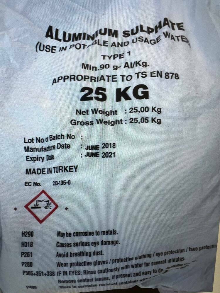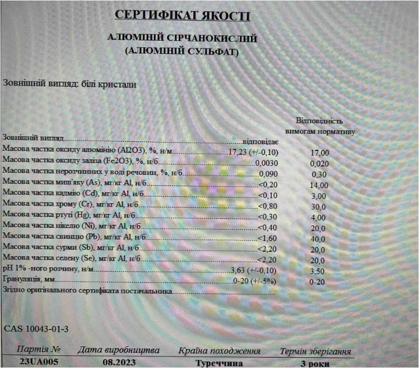 Алюміній сернокислий (алюміній сульфат) — білий порошок, розчинний