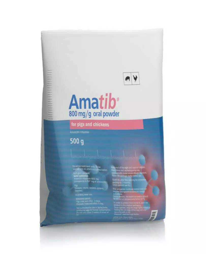 Птиця: 250 г / 1000 л води / день (еквівалентно 10-20 мг амоксициліну / кг маси тіла / день) протягом 3-5 днів.