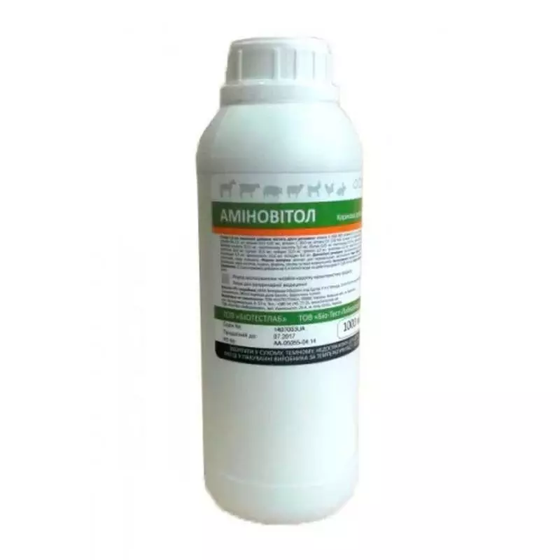 АМІНОВІТОЛ – кормова добавка, що має сукупні фармакологічні властивості окремих вітамінів та амінокислот, які сприяють нормалізації обміну речовин в організмі, підвищенню його резистентності, позитивно впливають на продуктивність, збереженість і відтворювальні функції тварин та птиці.