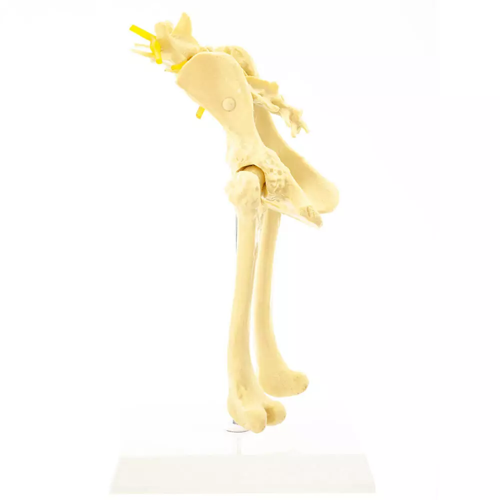 Анатомічна модель стегна собаки демонструє здорову та уражену артритом кістку стегна. Скелетна модель відповідає за масштабом стегну собаки середнього розміру. Конструкція встановлена на білій пластиковій основі за допомогою металевого тримача.
