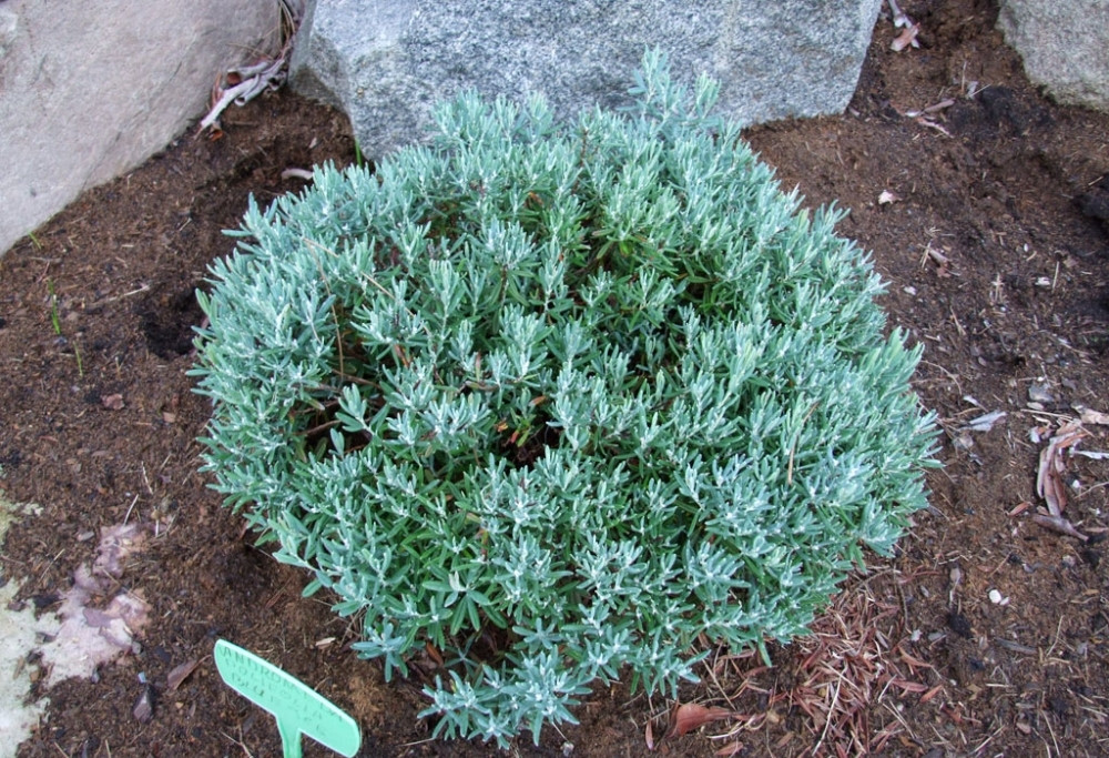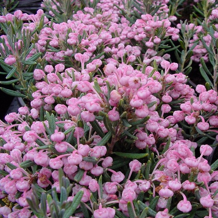 Опис: Невеликий вічнозелений чагарник з піднятими пагонами, густо вкритими вузьким, щільним листям. В англомовних країнах чагарник отримав назву 'bog rosemary' - 'болотний розмарин' - за зовнішню схожість з цією рослиною. Відмінною рисою сорту 'Blue Ice' є зеленувато-блакитне або навіть сірувато-блакитне забарвлення листя, яке чудово поєднується з рожевими кулястими квітками, що розпускаються на кінцях пагонів у травні - червні.