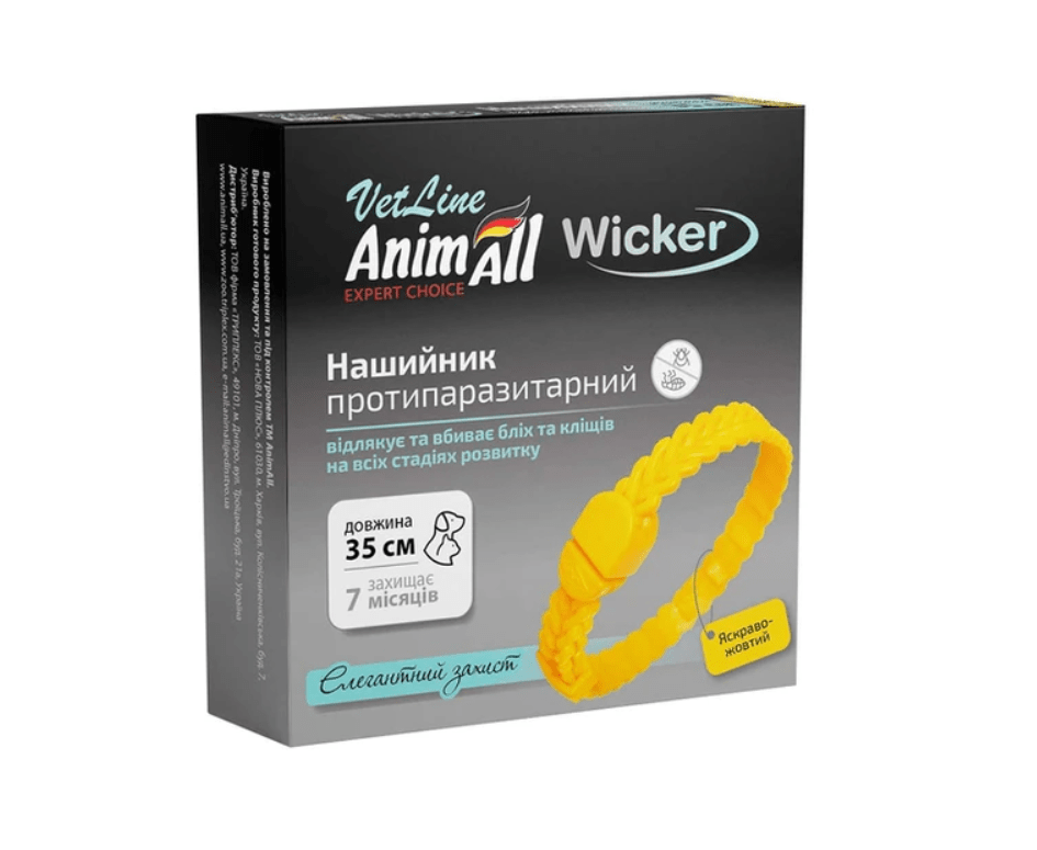 AnimAll Ветлайн Вікер (AnimAll VetLine Wicker) нашийник протипаразитарний для собак та котів Застосування. Профілактика та лікування собак та кішок при ураженні: бліхами (Ctenocephalides felis, St. canis, Pulex irritans), вошами (Linognathus setosus), волосоїдами (Trichodectes canis, Felicola subrostratus) та паразитоформними кліщами (Ixodes spp., Hyal. , Rhipicephalus spp., Boophilus calcaratus). Можна застосовувати як один із засобів при лікуванні алергічного блошиного дерматиту.
