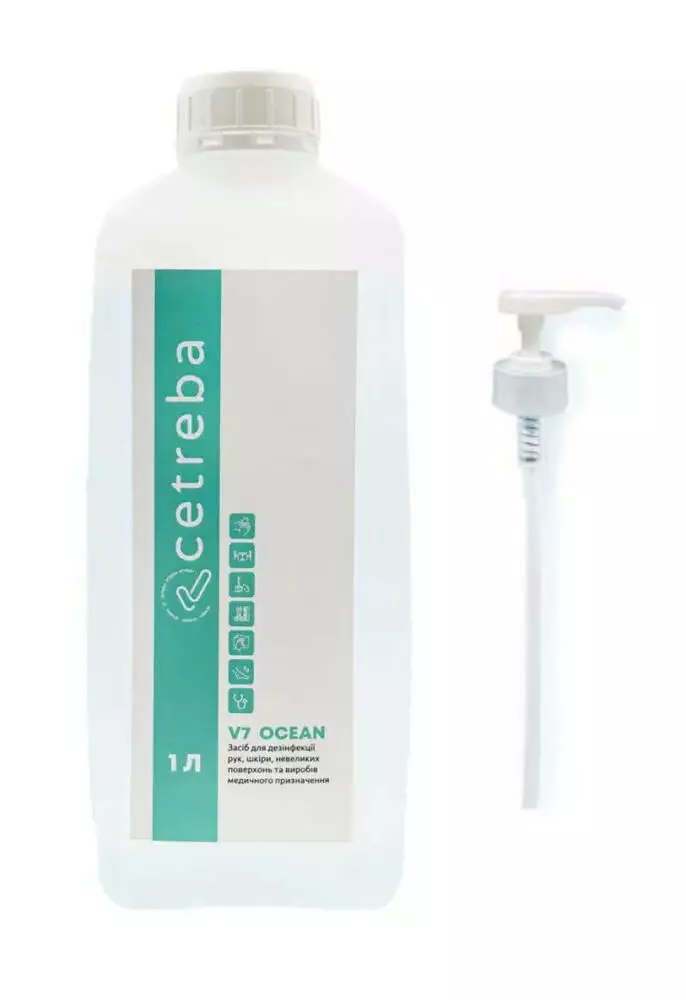 Засіб V7 для дезінфекції рук, шкіри, невеликих поверхонь та виробів медичного призначення.
