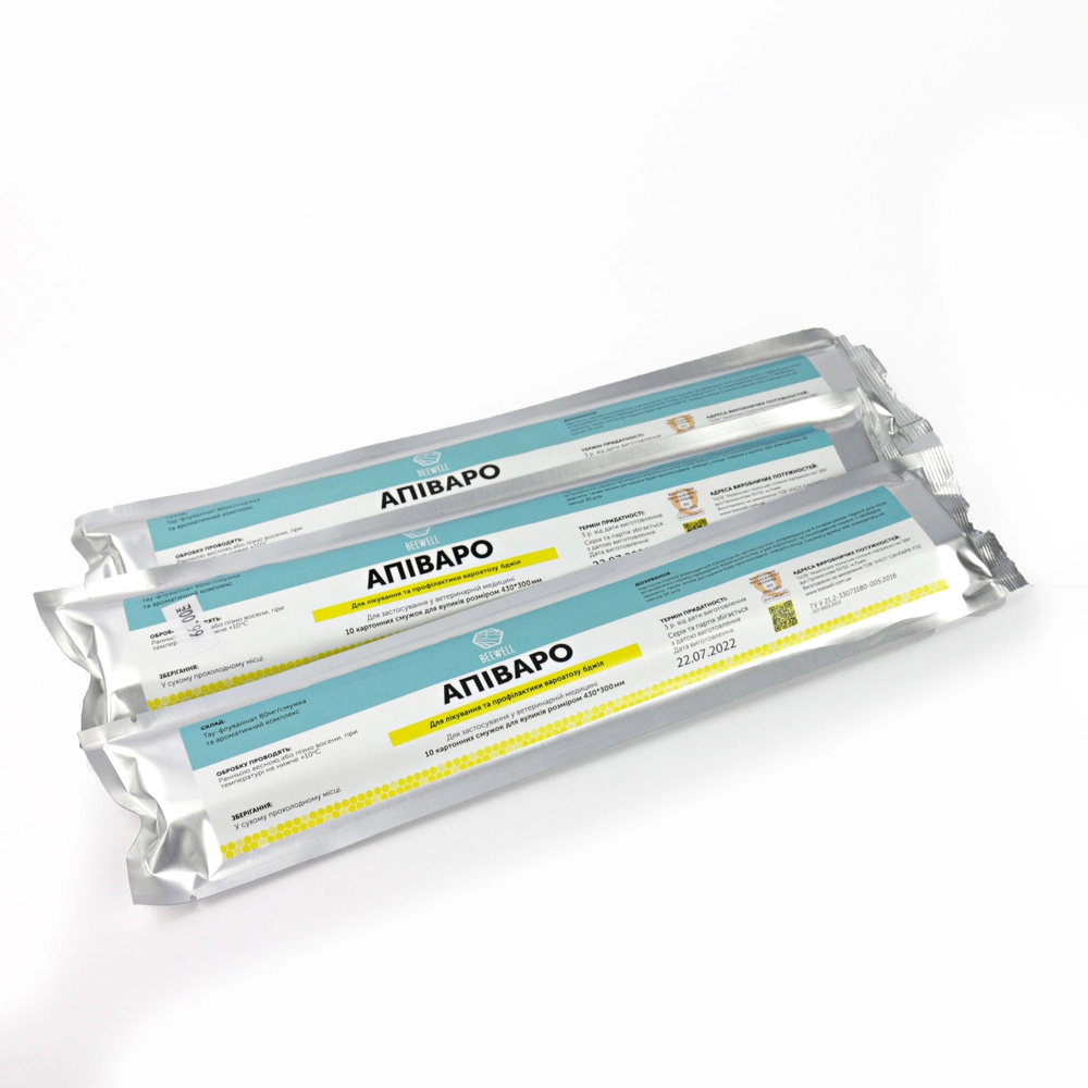 Пластиковий пакет, який містить картонні смужок та дерев’яні тримачі, за допомогою яких смужка буде закріплюватись в розплідній частині гнізда. Інструкція по застосуванню надрукована на упаковці.
