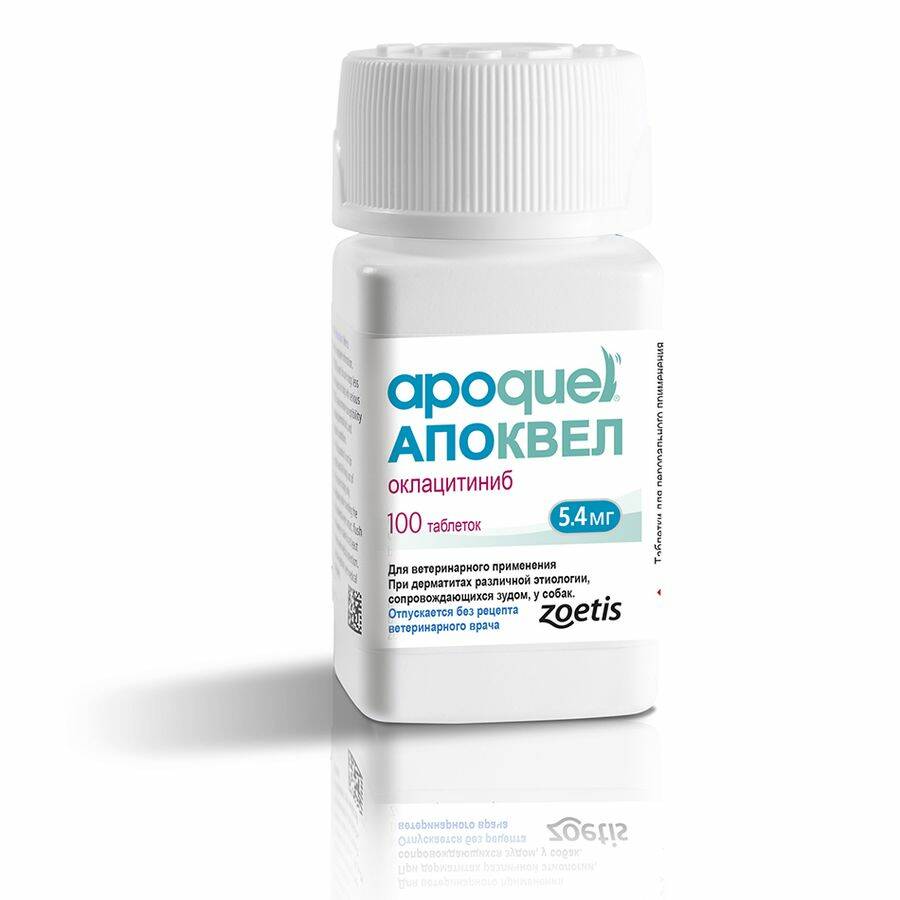 таблетки для перорального применения. Апоквел выпускают в трех дозировках, содержащих в 1 таблетке в качестве действующего вещества оклацитиниба малеат (в пересчете на оклацитиниб) 3,6 мг; 5,4 мг и 16 мг соответственно, а также вспомогательные вещества: микрокристаллическую целлюлозу, лактозы моногидрат, карбоксиметил-крахмал натрия, магния стеарат, плёнкообразователь «Opadry II White» и воду очищенную.