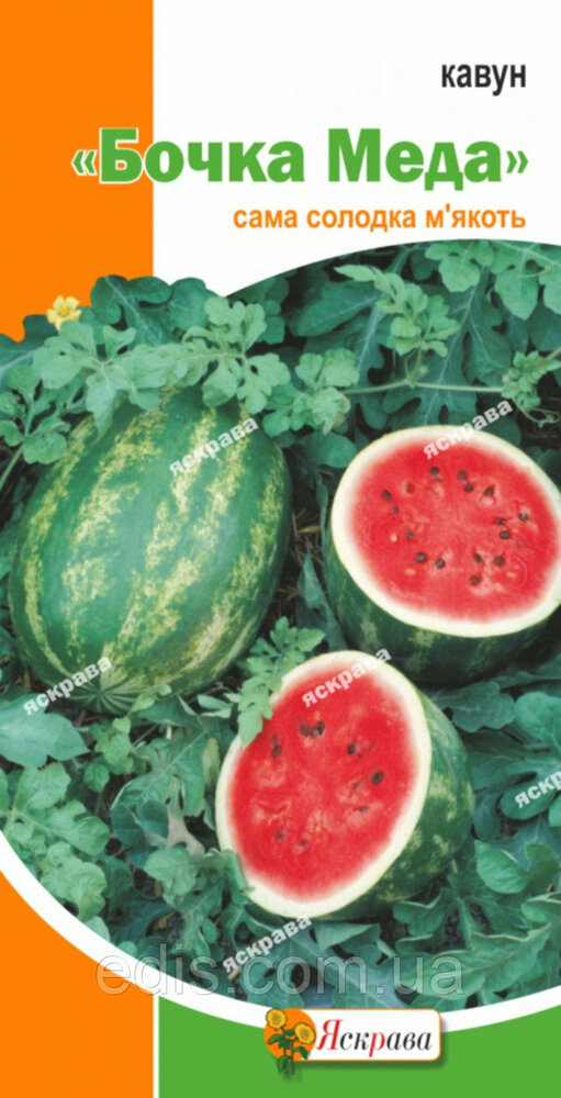 Кавун середньостиглий Бочка Меду, насіння ТМ Яскрава, фасовка 20 г Середньо-ранній сорт (від сходів до початку плодоношення 90-95 днів). Призначений для вирощування у відкритому грунті і під тимчасовими плівковими укриттями. Плоди овально-циліндричні, салатово-зелені, з широкими розмитими більш темними смугами, масою 2,5-6 кг М'якоть яскраво-рожева, щільна, зерниста, солодка. Кора середньої товщини. Насіння середнього розміру, кремові, без малюнка. Плетиста рослина, головна батіг довга. Лист середнього розміру, сіро-зелений, сильнорозсічене, слабоморщинистый. Хороша транспортабельність плодів.