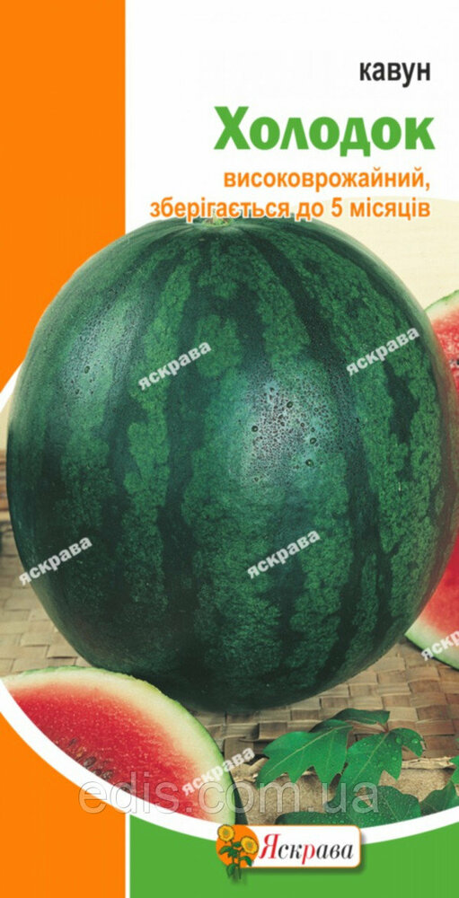 Кавун Холодок 2 г Середньопізній (85-97 днів від сходів до першого збору плодів) сорт. Рослина потужна, батогів багато, головний батіг понад 5 м. Плід видовжено-кулястий, середня маса товарного плоду 4,2 кг Малюнок: темно-зелені, майже чорні шипуваті смуги змикаються. Кора середня, розріз світло-зелений, м'якоть інтенсивно-червона з рожевим відтінком, ніжна, солодка, соковита, смакові якості добрі. Цінність сорту: транспортабельність, зберігання гарний (3 місяці після знімання плодів). Схема посадки 70х150 див.