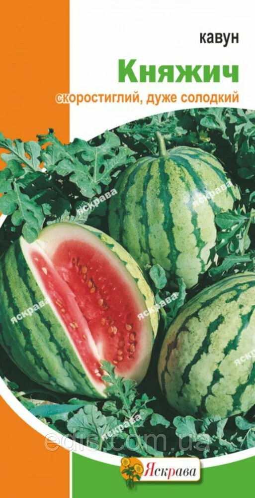 Кавун кримсон світ 2 г Очень оригинальный среднеспелый сорт (от всходов до начала плодоношения 90-95 дней), предназначен для выращивания в открытом гунте и под временными пленочными укрытиями. Плоды овально-цилиндрические, Сорт селекции Института южного овощеводства и бахчеводства УААН. Скороспелый, срок созревания - 68 - 73 дня. Плоды округло-овальной формы, гладкие, светло-зеленые с темно-зелеными широкими, шиповатими полосами. Кора средней толщины (10 - 12 мм), мякоть малинового цвета, сочная, с повышенным содержанием сахара. Средняя масса плодов - 5,5 - 6 кг. Транспортабельность хорошая. Стійкий до антракнозу, бактеріозу, альтернаріозу. Рекомендується для вирощування у весняних теплицях і відкритому гунте.
