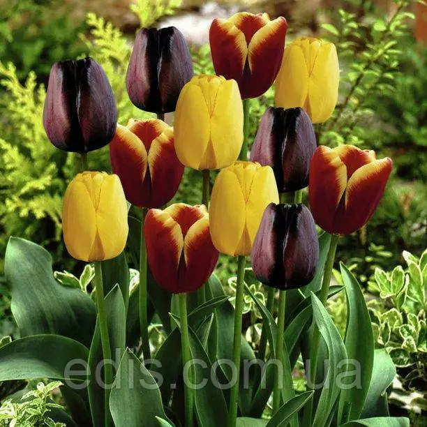 У набір входить 9 цибулин високорослих тюльпанів середнього терміну цвітіння (кінець квітня - початок травня). Ці сорти не вимагають щорічного викопування, тому сміливо можна збагатити цю композицію іншими багаторічними квітами. Наприклад, одночасно з тюльпанами цвітуть аліуми, мускарі, та анемони.