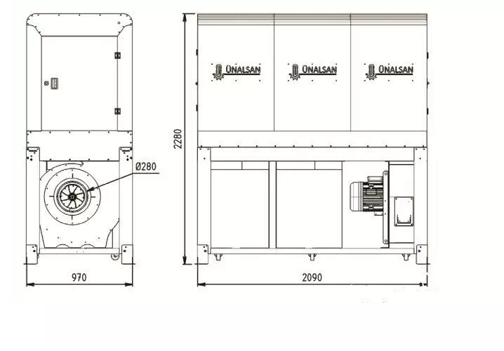 Корпус аспирационной установки полностью закрыт металлическим кожухом, где все стыки листового металла герметизированы силиконом. Это позволяет использовать установку не только внутри цеха, но и на улице. При наружной установке аспирации, в верху кожуха есть технологические отверстия для подсоединения воздуховодов, для возврата отфильтрованного теплого воздуха назад в производственный цех.