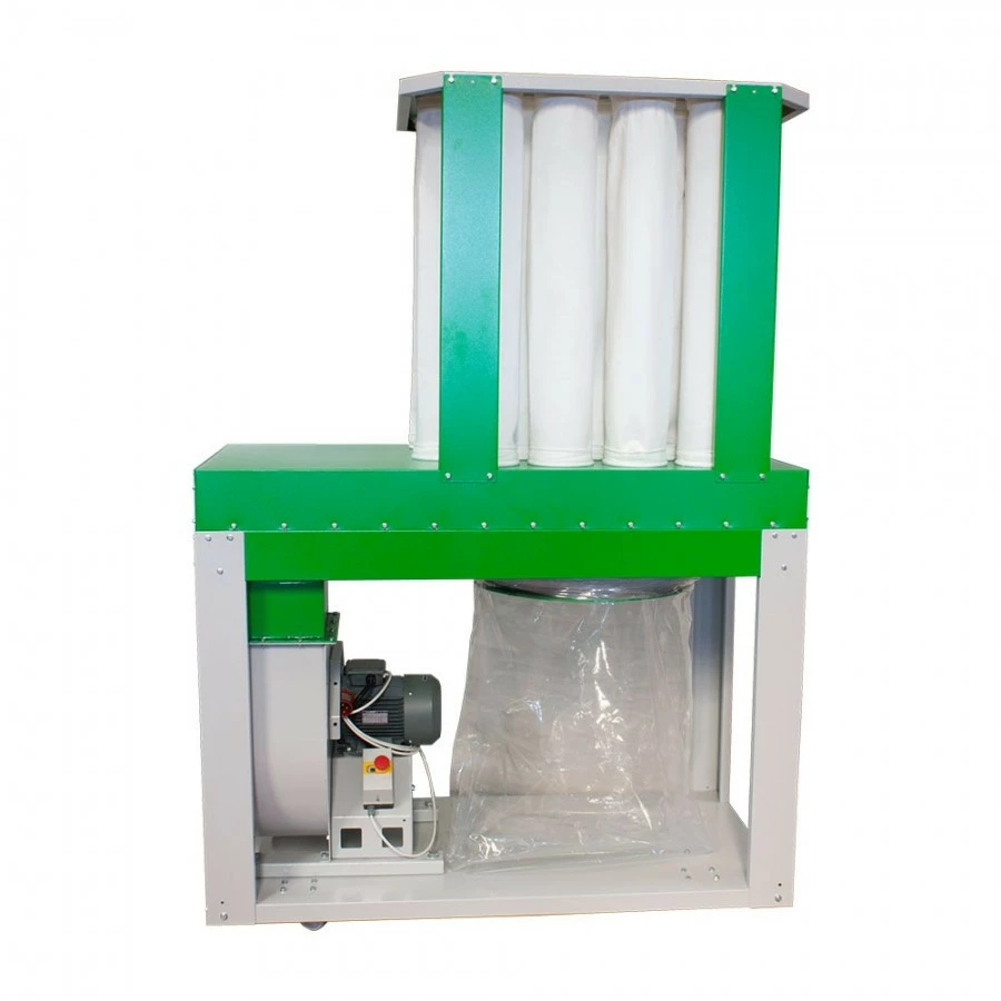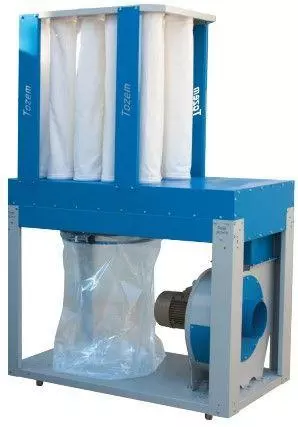 Пыль и древесные отходы собираться в полиэтиленовые прозрачные мешки, которые герметично закреплены металлическими хомутами на корпусе фильтрационной установки.
