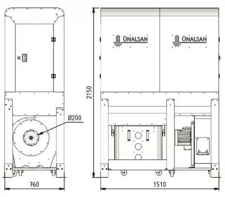 Корпус аспирационной установки полностью закрыт металлическим кожухом, где все стыки листового металла герметизированы силиконом. Это позволяет использовать установку не только внутри цеха, но и на улице. При наружной установке аспирации, в верху кожуха есть технологические отверстия для подсоединения воздуховодов, для возврата отфильтрованного теплого воздуха назад в производственный цех.