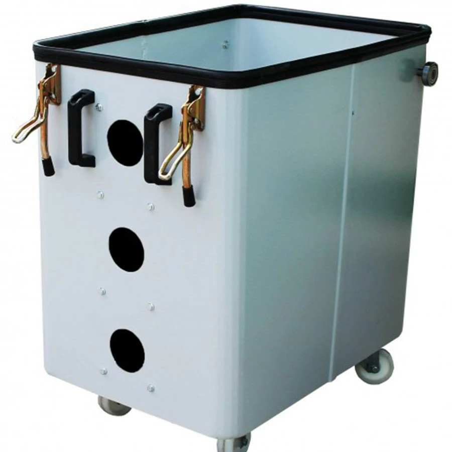 Пыль и древесные отходы собираться в выкатные металлические бункера, которые тоже установлены на поворотные пластиковые колеса, для удобства их дальнейшего опустошения. На каждом бункере есть большие смотровые окна для визуального контроля их наполнения.