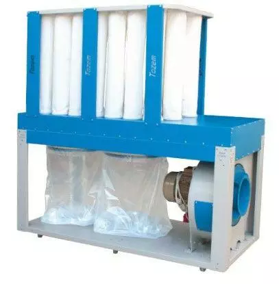 Пыль и древесные отходы собираться в полиэтиленовые прозрачные мешки, которые герметично закреплены металлическими хомутами на корпусе фильтрационной установки.