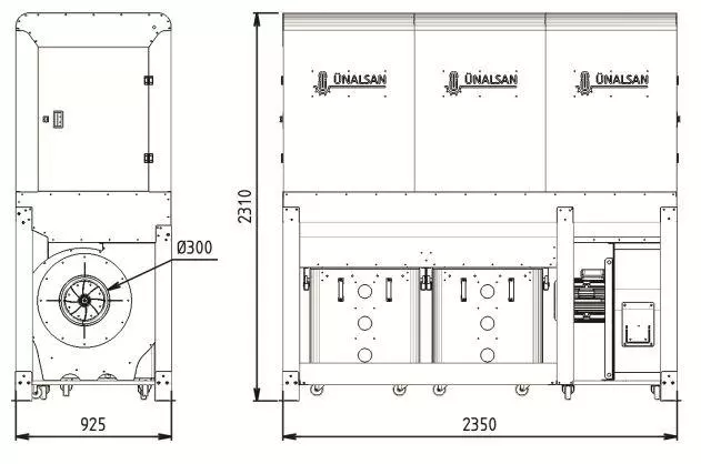 Корпус аспирационной установки полностью закрыт металлическим кожухом, где все стыки листового металла герметизированы силиконом. Это позволяет использовать установку не только внутри цеха, но и на улице. При наружной установке аспирации, в верху кожуха есть технологические отверстия для подсоединения воздуховодов, для возврата отфильтрованного теплого воздуха назад в производственный цех.