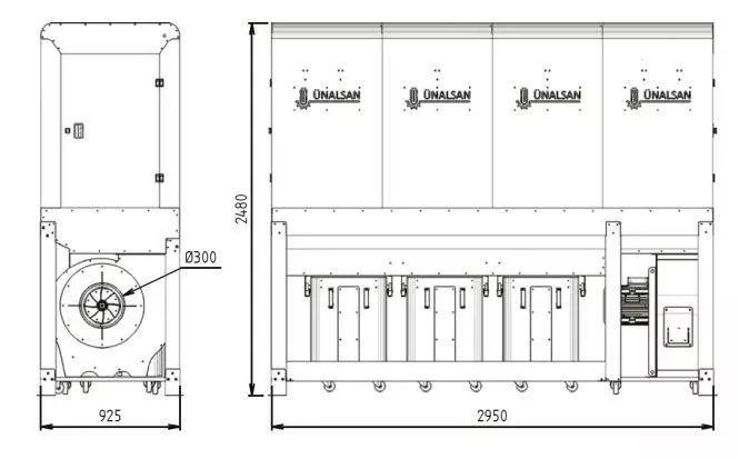 Корпус аспирационной установки полностью закрыт металлическим кожухом, где все стыки листового металла герметизированы силиконом. Это позволяет использовать установку не только внутри цеха, но и на улице. При наружной установке аспирации, в верху кожуха есть технологические отверстия для подсоединения воздуховодов, для возврата отфильтрованного теплого воздуха назад в производственный цех.