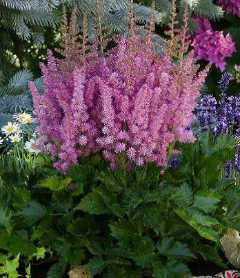 Це один із найкращих карликових сортів. Завдяки ефектним листочкам, пишним суцвіттям, розлогий кущ астильби декоративний протягом усього садового сезону. Під час цвітіння створюється фантастичне видовище, немов перо екзотичної птиці '' фламінго'' в спекотному мареві височіє над темно-зелено-бордовим, блискучим, гофрованим листям. Квіти зібрані у витончені суцвіття- китиці. Надає перевагу злегка кислим, вологим грунтам. Морозостійкий.