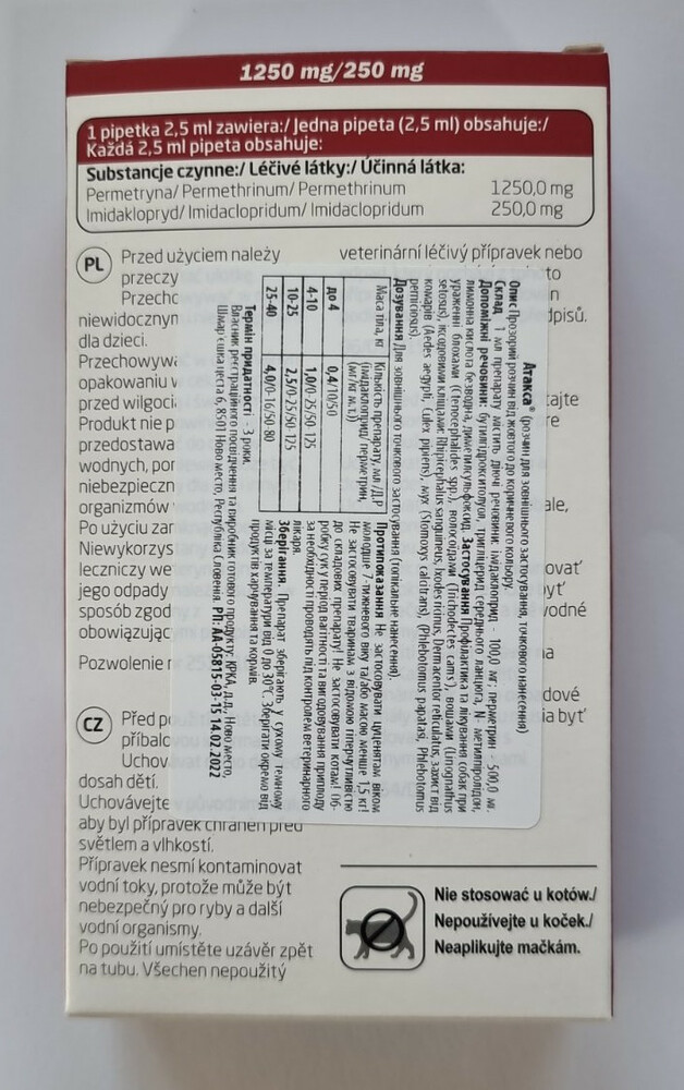 Препарат Атакса® ефективний проти імагінальних і преімагінальних та личинкових фаз розвитку бліх (Ctenocephalides canis, Ctenocephalides felis), власоїдів (Trichodectes canis), іксодових кліщів (Rhipicephalus sanguineus та Ixodesricinus, Dermacentor Aedes aegypti, Culex pipiens), мух (Stomoxys calcitrans) та москітів (Phlebotomus papatasi, Phlebotomus perniciosus).