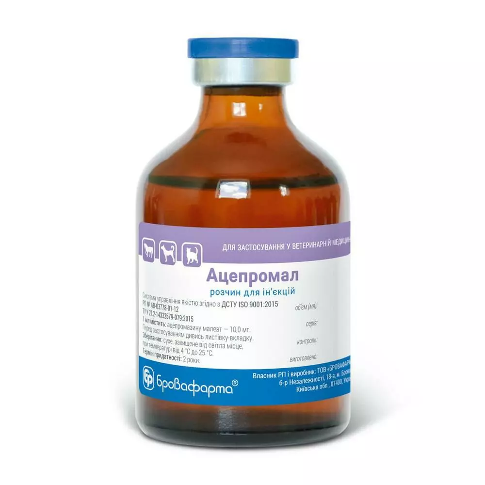 Ацепромазину малеат – нейролептик групи фенотіазинів, препаратів седативного спрямування. Використання його у вигляді 1% ін'єкційного розчину забезпечує прояв заспокійливої та міорелаксантної дії шляхом зниження збудження центральної нервової системи. У той же час препарат виявляє гіпотермічну, гіпотензивну, антигістамінну, адренолітичну, спазмолітичну, протиблювотну дію, прискорює та посилює дію снодійних та місцево анестезуючих засобів.