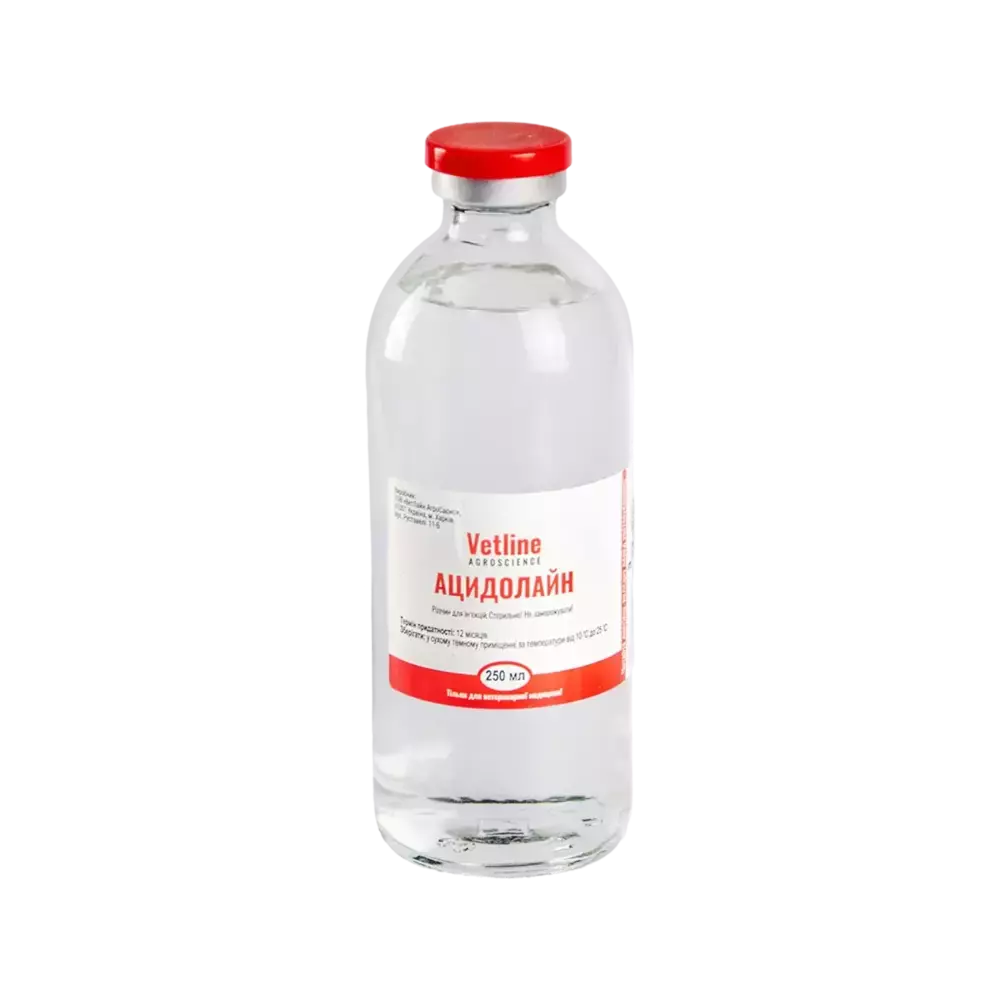 «Ацидолайн» - комплексний препарат – коректор кислотно-лужного стану. Склад препарат містить: - бікарбонат натрію, - ацетат натрію, - цитрат натрію, - наповнювач. Фармацевтична форма Препарат являє собою прозору стерильну рідину. Фармакологічні властивості «Ацидолайн» має залужуюючі властивості, проте не спричиняє різкого зростання рН крові та міжклітинної рідини завдяки наявністю забуферених сполук. Відповідно, не виникає компенсаторна гіпервентиляція легень та посилення ацидозу. Сполуки-регулятори кислотності, які входять до складу препарату, не впливають на концентрацію глюкози та інсуліну в крові, відповідного порушення метаболізму вуглеводів та ліпідів у печинці, тому застосування «Ацидолайну» є доцільним при кетозах та гепатодистрофіях. Вид тварин Велика рогата худоба. Показання Застосовують профілактично та терапевтично в якості засобу корекції кислотно-лужного стану при кетозах, ацидотичних станах (стресові фактори, хвороби інфекційної та неінфекційної етіології), токсикозах, гіпотрофії новонародженого молодняку. Взаємодія з іншими засобами Не змішувати з розчинами, які володіють кислотними властивостями(аскорбінова кислота тощо). Застосування Препарат застосовують внутрішньовенно, інтераперитонеально або підшкірно, раз на добу у таких дозах: доросла велика рогата худоба - 250-750 мл; новонароджені телята - 2,5-3,5 мл на 1 кг маси тіла. Побічні ефекти У рекомендованих дозах препарат не викликає у тварин побічної дії і ускладнень. Протипоказання Індивідуальна чутливість до компонентів препарату. Каренція Продукцію тваринництва використовують без обмежень. Форма випуску Препарат «Ацидолайн» випускають розфасованим по 250 см3 у стерильні герметично закриті скляні флакони, закупорені гумовими пробками і обкатані алюмінієвими ковпачками. Термін придатності Термін придатності препарату при дотриманні умов зберігання 2 роки з дня виготовлення. Зберігання Зберігають у сухому місці при температурі від +10 °С до +25 °С