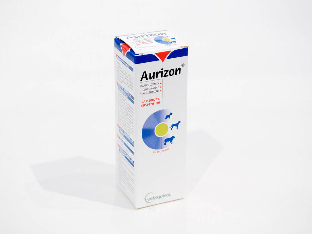 Основними діючими речовинами вушних крапель Ауризон є: марбофлоксацин 3 мг, клотримазол 10 мг і дексаметазон ацетат 0,9 мг в 1 мл препарату, а також допоміжні компоненти: пропив галат і розчинники. Ауризон являє собою однорідну суспензію жовтуватого кольору, без запаху, розфасована в пластикові флакони з м'якими дозуючими піпетками по 10 мл.