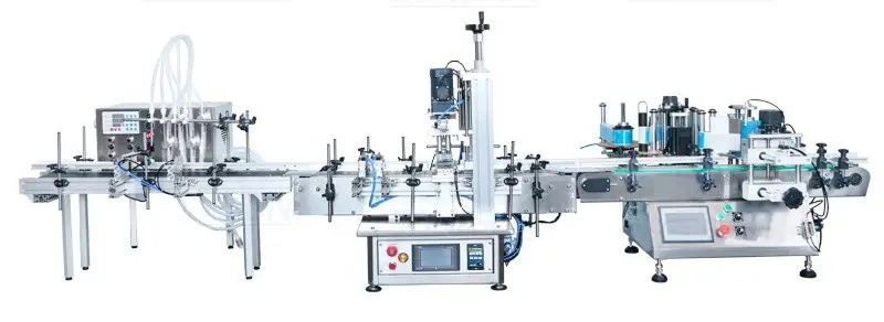Автоматичний виробничий конвеєр настільного типу підходить для дрібносерійного виробництва, він складається з розливної машини з насосом, укупорщика і обладнання для наклеювання етикеток. Ця виробнича лінія може автоматично наповнювати рідини, закупорювати пляшки і наклеювати етикетки. Всі складові конвеєрної лінії забезпечують злагоджену безперебійну роботу. Передбачена можливість оптимальної настройки для забезпечення економного режиму при високій продуктивності. Ідеально підходить для фасування соків, ефірних масел, косметичних та фармакологічних засобів, вин та інших рідин.