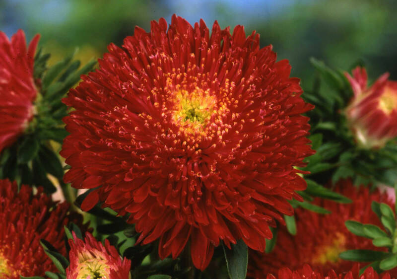 Айстра Принцеса, яскраво-червона - однорічна високоросла рослина до 75 см. Формує розлогий кущ з махровими, великими квітами, 9-13 см у діаметрі, яскраво-червоного кольору. Центральна частина суцвіття складається з великих трубчастих квітів. На розсаду насіння сіють у березні. На постійне місце рослини висаджують наприкінці травня, на відстані 25-30 см одна від одної. Айстра невибаглива до вирощування, універсальна рослина. Цвіте з травня до заморозків. Підходить для вирощування в контейнерах, вазонах і на зріз.