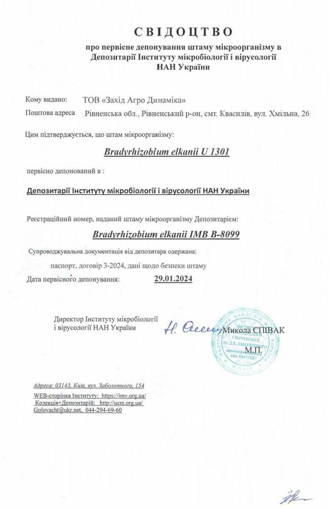 Форма: сухий стерильний препарат високоефективних штамів Bradyrhizobium elkanii на основі торфу