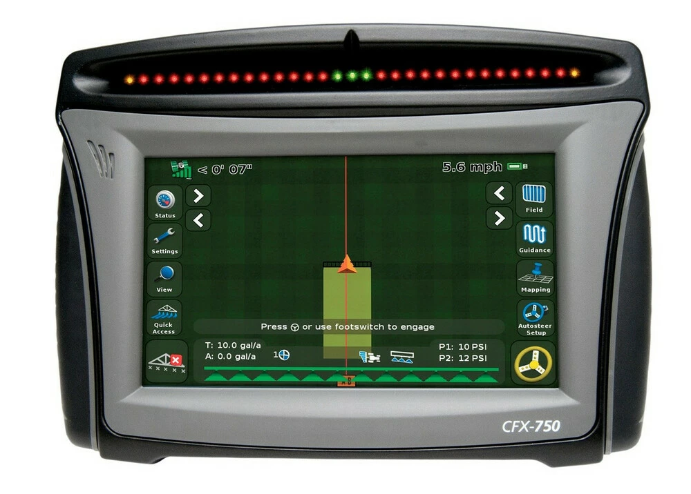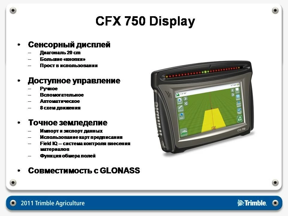 Навігатор CFX-750 призначений для високоточних робіт і дозволяє отримувати точність до 2 см при використанні RTK. Принципова відмінність від EZ-250 в точності і функціональних можливостях. Має великий екран з діагоналлю 8 дюймів. Trimble CFX-750 має вбудований 2-х частотний L1/L2 GPS-приймач. Дозволяє підключати автопілот, до 2-х відеокамер і зовнішнього GSM/GPRS модему.