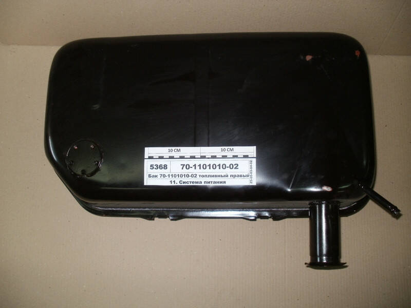 Бак топливный правый металлический устанавливается на тракторах МТЗ-80, 82, 892, 920, 950, оригинальный, производства ОАО 'Минский тракторный завод', ОАО 'МТЗ', г. Минск, Республика Беларусь Топливный бак (бензобак) — ёмкость для хранения запаса жидкого топлива (бензин, керосин, дизельное топливо) непосредственно на борту транспортного средства или технического устройства, получающего энергию от жидкотопливного двигателя внутреннего сгорания.Также топливные баки (ёмкости) для дизельного топлива используются в системах автономного отопления — для обеспечения топливом дизельных отопительных котлов. Топливный бак, установленный на борту транспортного средства, состоит из герметичного корпуса с имеющейся на его поверхности заливной горловиной, снабжённой запорной крышкой. Также на корпусе топливного бака в случае необходимости располагается отверстие для введения датчиков контроля уровня топлива, или его давления. Топливные баки также могут иметь сливное отверстие, снабжаемое запорной пробкой или краником (например, на тепловозах). Баки, используемые для обеспечения отопительных котлов, представляют собой герметичные пластиковые ёмкости сферической, кубической или прямоугольной формы, имеющие входное отверстие в верхней части, объёмом 500, 750, 800, 1000, 1100, 1500, 2000 литров (возможны и другие размеры, указанные являются наиболее востребованными). Бак соединяется с отопительным котлом медной трубой при помощи специального фиксирующего пакета, состоящего из прибора для измерения уровня топлива в баке, шланга с топливозаборником, аэратора и деталей крепежа. В систему обеспечения топливом одного котла может входить несколько топливных баков разной ёмкости, которые соединяются между собой посредством дополнительных фиксирующих пакетов.