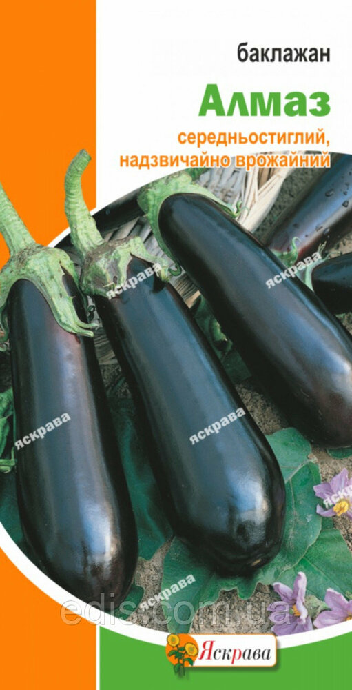 Баклажан Алмаз 0,3 г Многие овощеводы не могут понять, почему они собирают столь скромные урожаи баклажанов, ведь гунт плодородный и легкий, лето теплое, а поливы регулярны. Помимо условий содержания огромное значение при выращивании играет сорт, а также семена, вернее, их качество. Баклажан Алмаз – это культура, о которой слышны лишь положительные отзывы. Описание данного сорта состоит лишь из одних достоинств: термін дозрівання: 110-130 днів (середньостиглий); плоди: 14-17 см, 100-200 г, циліндричні, фіолетові, блискучі, дозрівають одночасно. Смак дуже приємний, без звичної гірчинки; розмір куща: відрізняється компактністю (45-55 см); схильність до захворювань: комплексна стійкість. Оскільки успіх вирощування баклажанів Алмаз багато в чому залежить від насіннєвого матеріалу, придбати його варто у надійного виробника, яким в Україні є компанія «Едіс». Після ретельної лабораторної перевірки у фасувальні пакети потрапляють тільки самі сильні екземпляри.