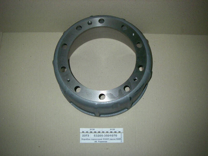 Барабан тормозных механизмов КАМАЗ ЕВРО-1, -2 кроме тяжелой серии КАМАЗ-6520 и его мод., а так же прицепов НЕФАЗ. Имеет 10 крепежных отверстий. Барабан на ступицу под дисковые колеса. Барабанный тормоз — это вид тормозной системы, состоящей из вращающегося барабана, в котором торможение достигается прижатием тормозных колодок к барабану. Обычно в барабанном тормозе колодки находятся внутри полого тормозного барабана — сегодня именно такой механизм называется барабанным тормозом «по умолчанию», вне исторического контекста. В случае, если колодки располагаются с внешней стороны плоского чугунного диска, тормозной механизм называется дисковым. Существует ещё одна разновидность барабанного тормоза — ленточный тормоз, в котором торможение достигается «охватом» барабана гибкой металлической тормозной лентой. В железнодорожном транспорте эпохи паровой тяги применялись также барабанные тормоза, в которых чугунный барабан тормозился за счёт прижимающейся к нему снаружи тормозной колодки с медной накладкой.