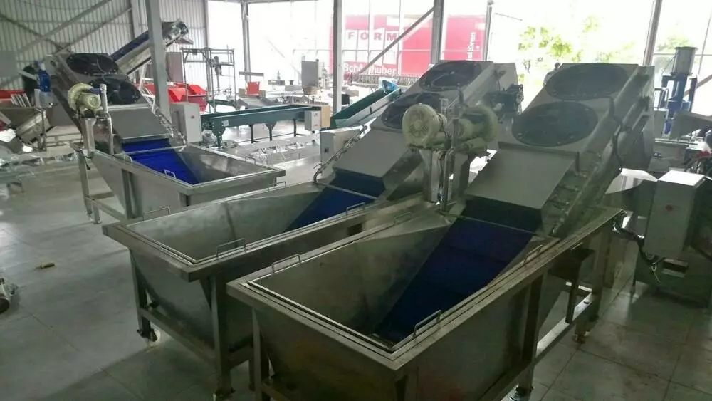 Принцип роботи: Продукція за допомогою системи барботажа омивається від бруду і надходить на транспортер, на якому встановлена система форсунок для додаткового омиву продукції від води з ванни, після чого продукт проходить через систему обдування і виходить через розвантажувальний бункер на інспекційний стіл / другою ступінь очищення.