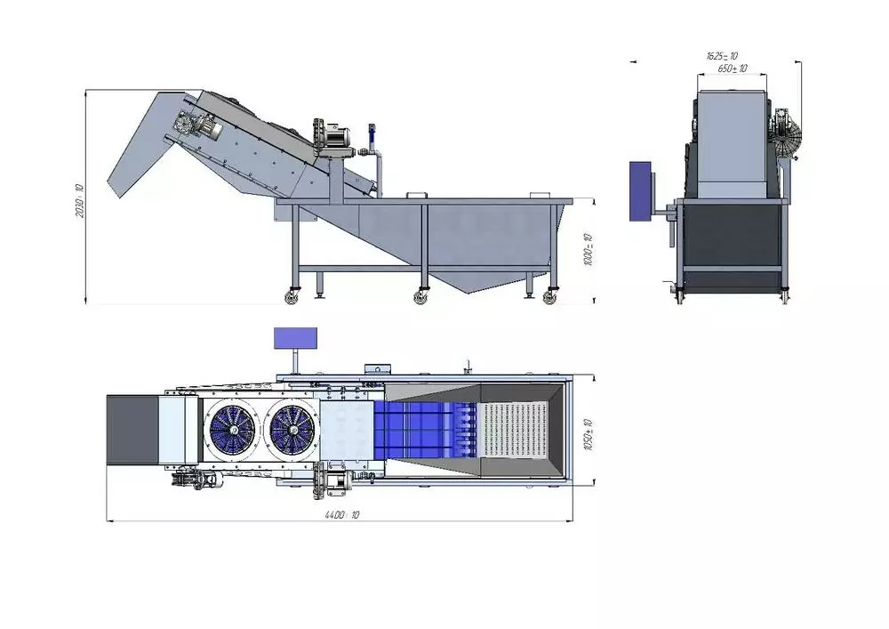 Барботажна мийка з вивантажувальним транспортером і обдування продукції від надлишку води. Призначена для очищення продукції від забруднення.