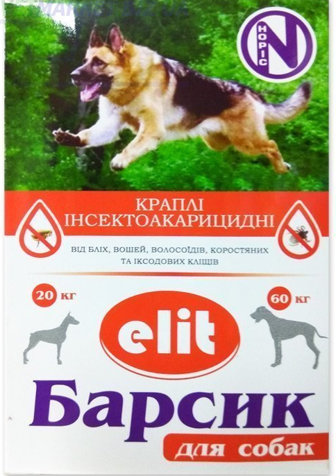 Барсик Еліт для собак антипаразитарний препарат призначений собакам з лікувальною та профілактичною метою при ентомозах (воші, блохи, власоїди), саркоптозі, нотоедрозі та ураженні іксодовими та саркоптоїдними кліщами, а також для попередження. Препарат є прозорою маслянистою рідиною від жовтого до світло-коричневого кольору зі слабким специфічним запахом.