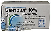 Байтрил 10% оральний антибіотик. Діюча речовина енрофлоксацин. Застосовують для лікування колібактеріозу, сальмонельозу, некротичного ентериту, стрептококозу, гемофільозу, кампілобактерійного гепатиту, мікоплазмозу, а також змішаних інфекцій птиці. Дозування 1мл на 1 л. води 3-5 днів підряд.