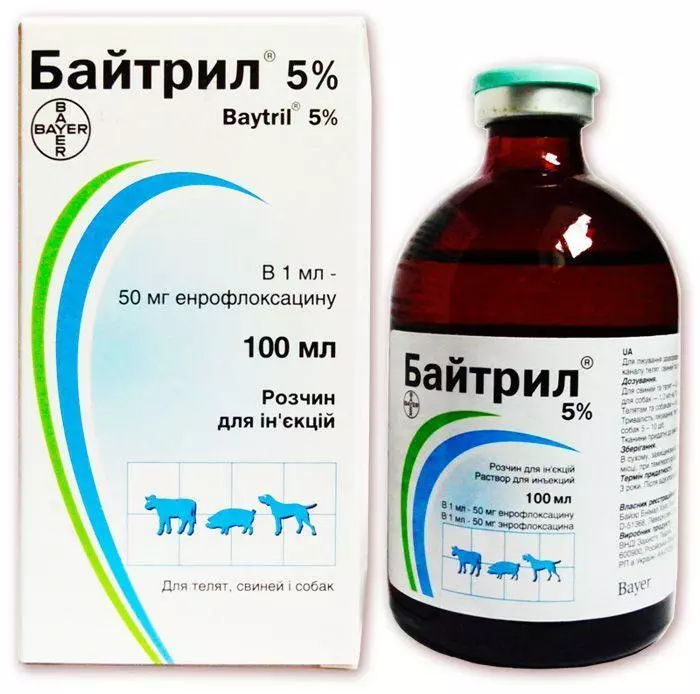 Бактеріальні інфекції у телят, свиней і собак, збудники яких чутливі до енрофлоксацину. Дози і спосіб застосування. Байтрил 5 % розчин для ін'єкцій вводять телятам і собакам підшкірно, свиням внутрішньом'язово в дозах: