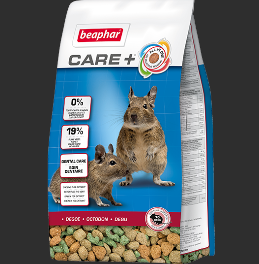 Більшість дегу з готовністю приймають корм. Однак якщо ви переходите з іншого корму, важливо зробити це поступово. Перші кілька днів змішуйте старий корм з CARE+. Завжди має бути доступ до чистої питної води та свіжого сіна. Зберігати в прохолодному сухому місці.