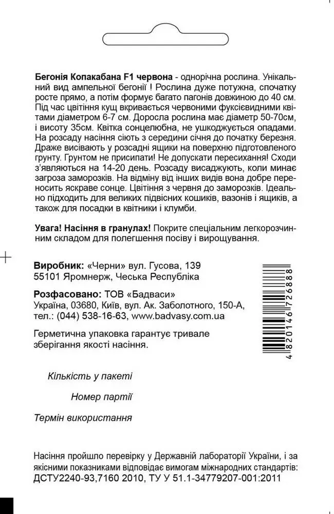 Бегонія Копакабана червона F1 - однорічна рослина висотою 35 см. Унікальний вид ампельної бегонії! Рослина дуже потужна, спочатку росте прямо, а потім випускає велику кількість пагонів довжиною до 40 см. Під час цвітіння рослина повністю покрита червоними фуксієвидними квітами діаметром 6-7 см. Доросла рослина в діаметрі 05-0,7 м. Не ушкоджується опадами. Сонцелюбна. На розсаду насіння сіють з середини січня до початку березня. Драже висівають у розсадні ящики на поверхню підготовленого стерильного грунту. Грунтом не присипати! Не допускати пересихання! Сходи з’являються на 14-20 день. Розсаду висаджують, коли мине загроза заморозків. На відміну від інших видів добре переносить яскраве сонце. Цвітіння з червня до заморозків. Ідеально підходить для великих підвісних кошиків, вазонів і ящиків, а також для посадки в квітники і клумби.
