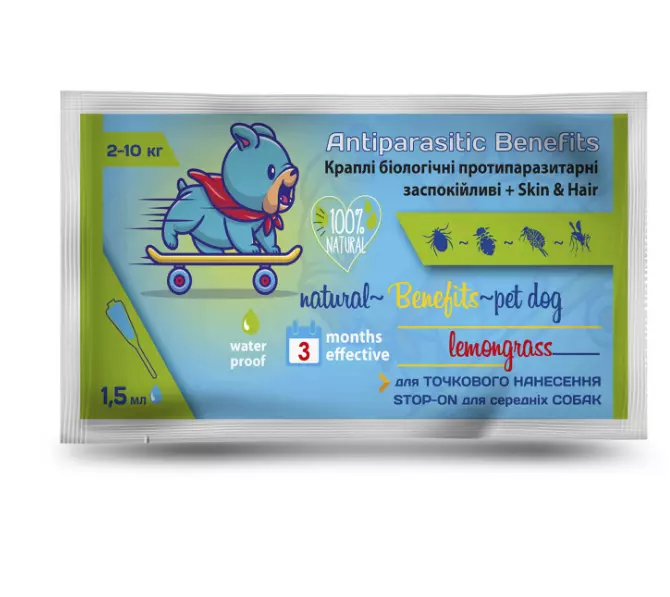 Протипаразитарні краплі BENEFITS для собак, на основі натуральних ефірних олій, забезпечують ефективний захист від бліх, іксодових кліщів, вошей і волосоїдів. Відлякують комарів і мух, знижуючи ризик зараження дирофіляріозом. Чинять антисептичну, протизапальну і легку анестезуючу дію. Знімають свербіж, заспокоюють, зволожують і тонізують шкіру. Комбінація феромонів і ефірних олій має виражений заспокійливий і антистресовий ефект і використовується для швидкої адаптації. Відсутність у складових хімічних сполук дає можливість використовувати цуценятам з 2-місячного віку, лактуючим і вагітним сукам, старіючим і ослабленим тваринам.