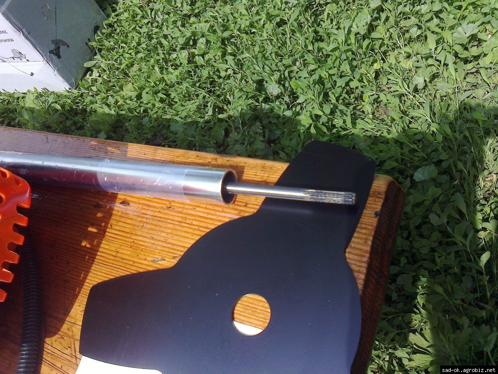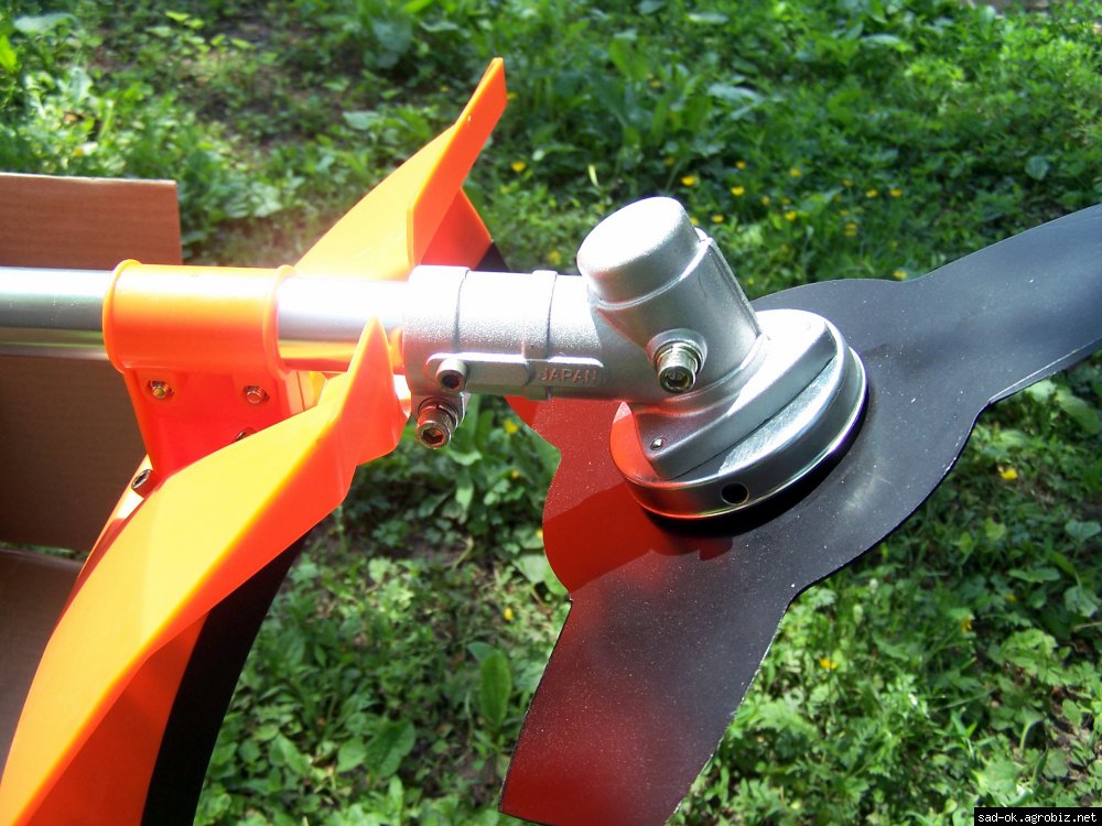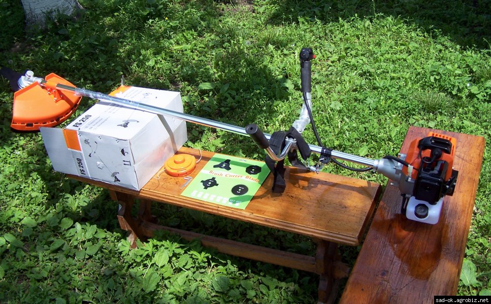 В комплекте также идет инструмент для регулировки и обслуживания, мерная бутылочка для приготовления смеси, ремень, нож 3 лопасти, шпулька с леской.