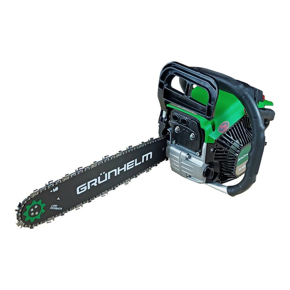 Опис Бензопила ланцюгова Grunhelm GS-4000MG Бензопила ланцюгова Grunhelm GS-4000MG - потужна і портативна механічна пила, що працює від двигуна внутрішнього згоряння, робочою частиною якої є ланцюгової пильний апарат, що складається із замкнутої в кільце ланцюга, що переміщається по напрямній шині. Особливості: Автоматична змащення ланцюга Ефективна антивібраційна система Металевий стартер Праймер для легкого запуску Паперовий повітряний фільтр